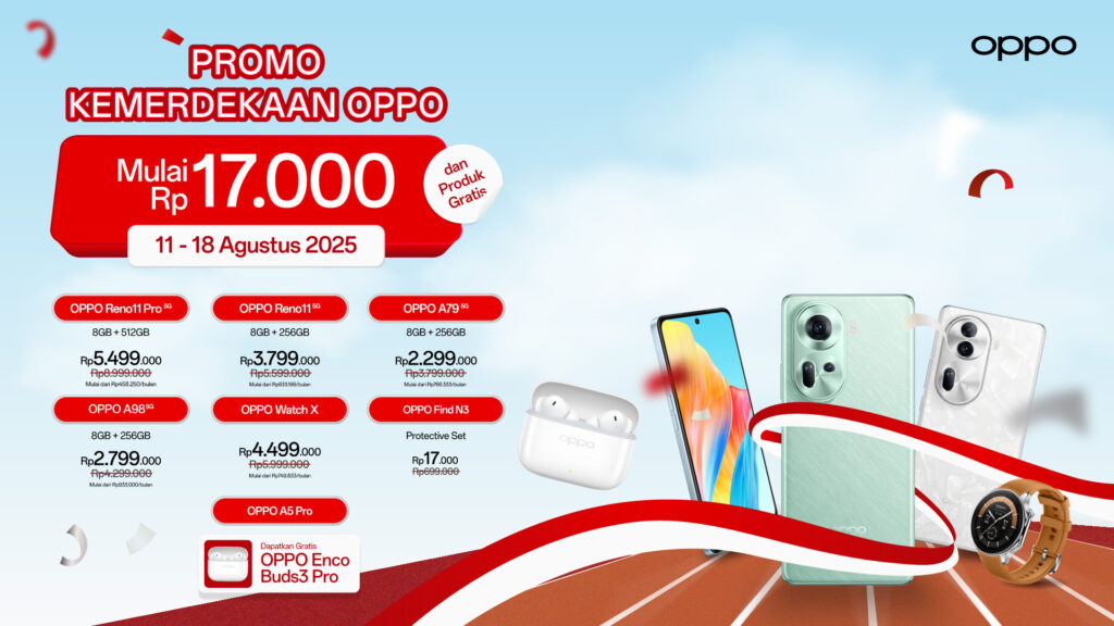 BagusTech – OPPO membuka rangkaian Promo Kemerdekaan lebih awal di kanal digital melalui OPPO Online Store pada 11–18 Agustus 2025. Selama sepekan, pengguna bisa menemukan potongan harga signifikan untuk smartphone, tablet, dan wearable, plus aksesori resmi yang turun hingga Rp17.000. Bagi yang menunggu momen terbaik untuk upgrade—atau sekadar melengkapi ekosistem—periode ini menawarkan kombinasi harga agresif + kemudahan transaksi yang sulit dilewatkan.