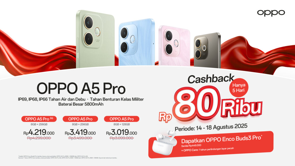 Promo berlangsung 5 hari pada 14–18 Agustus 2025. Cashback Rp80.000 berlaku untuk pembelian A5 Pro di kanal resmi OPPO (offline & online) selama kuota tersedia. Stok dan kuota cashback terbatas, serta S&K mengikuti tiap kanal/gerai. Disarankan mengecek keterangan promo pada halaman produk sebelum checkout.