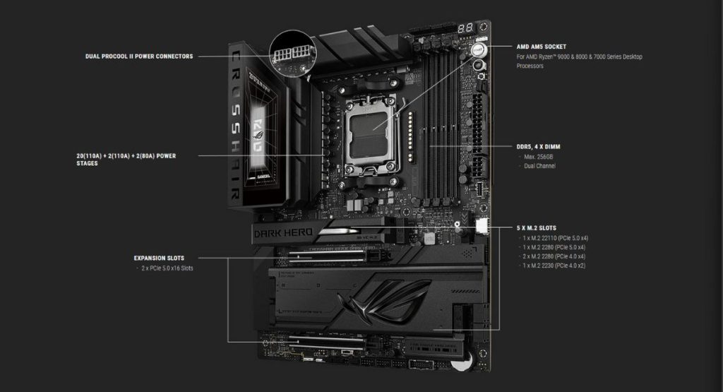 ASUS membekali Dark Hero dengan sistem power delivery 20+2+2 phase yang dirancang untuk menjaga suplai daya tetap stabil pada prosesor Ryzen 9000 Series, bahkan saat bekerja pada frekuensi tinggi. Dukungan memori DDR5 hingga kapasitas besar dipadukan dengan teknologi optimasi sinyal seperti NitroPath DRAM dan tuning firmware untuk memastikan stabilitas pada kecepatan tinggi.